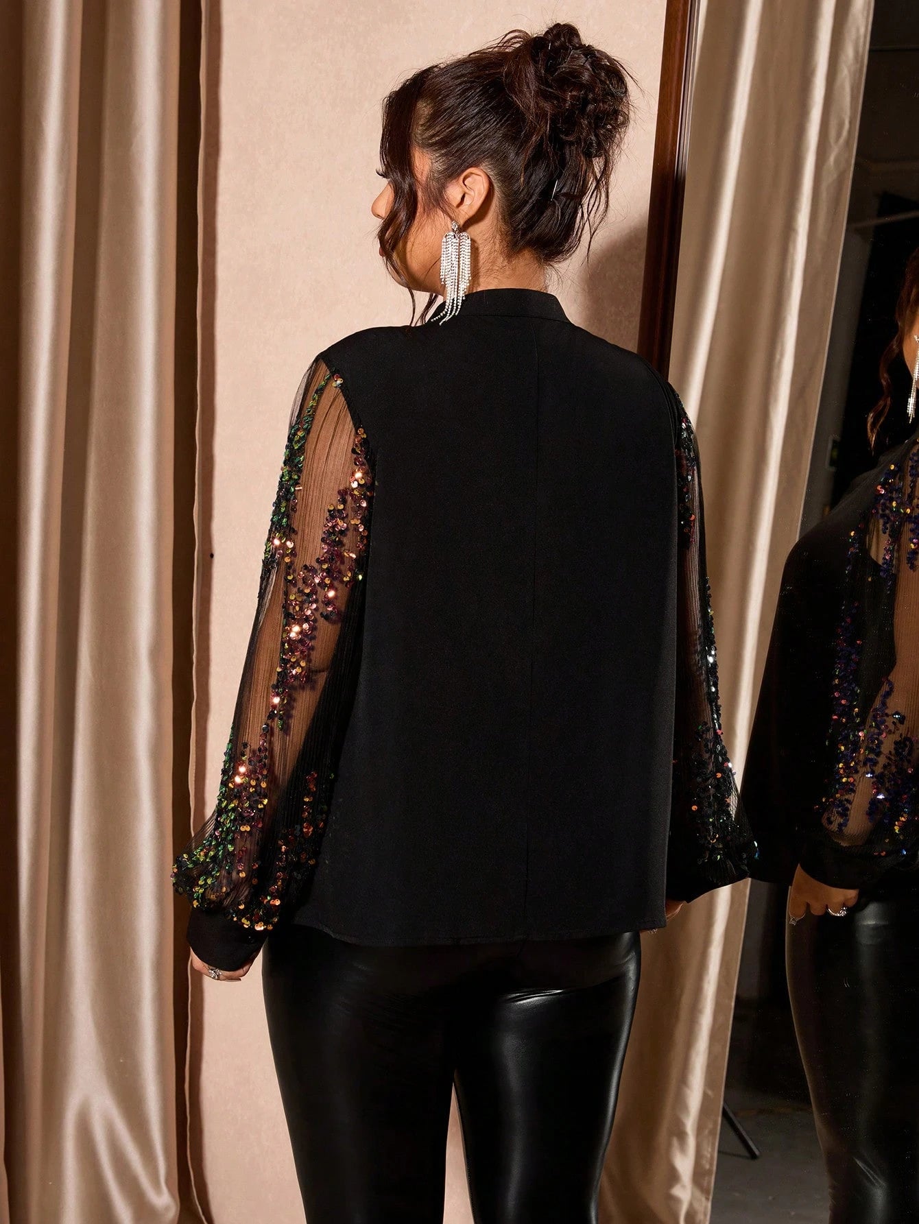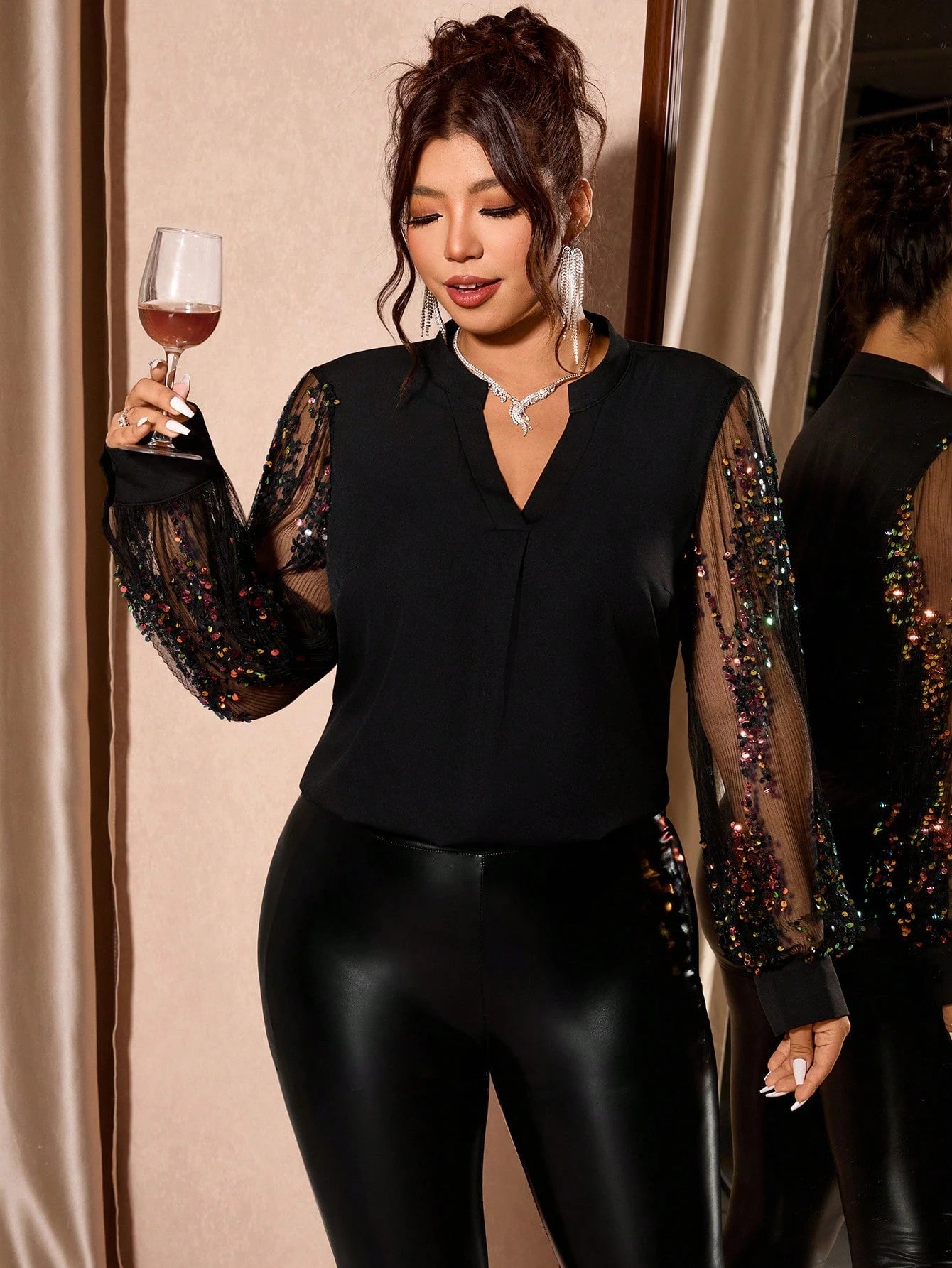 Blusa oversize con scollo a V, con stampa glitterata e applicazioni in foil, casual da donna
