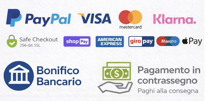 Accettiamo carte di credito, PayPal, Pagamento alla consegna. 1). CARTA DI CREDITO. inclusi Visa, MasterCard, JCB, Discover e Diners, American Express 2). PAYPAL. Il metodo di pagamento più conveniente e sicuro al mondo. 3). PAGAMENTO ALLA CONSEGNA, potrai pagare direttamente al corriere al momento della consegna, costo del servizio €4,00